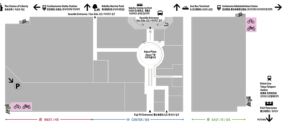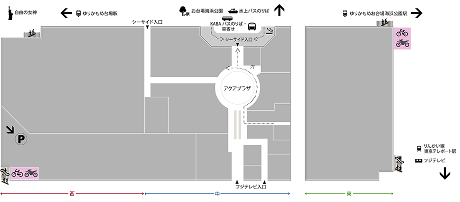 なお、アクアシティお台場外周部の歩道は「駐輪(自転車・バイク)禁止」となっており、「警察署による駐輪禁止取締の対象」となりますので予めご留意ください。